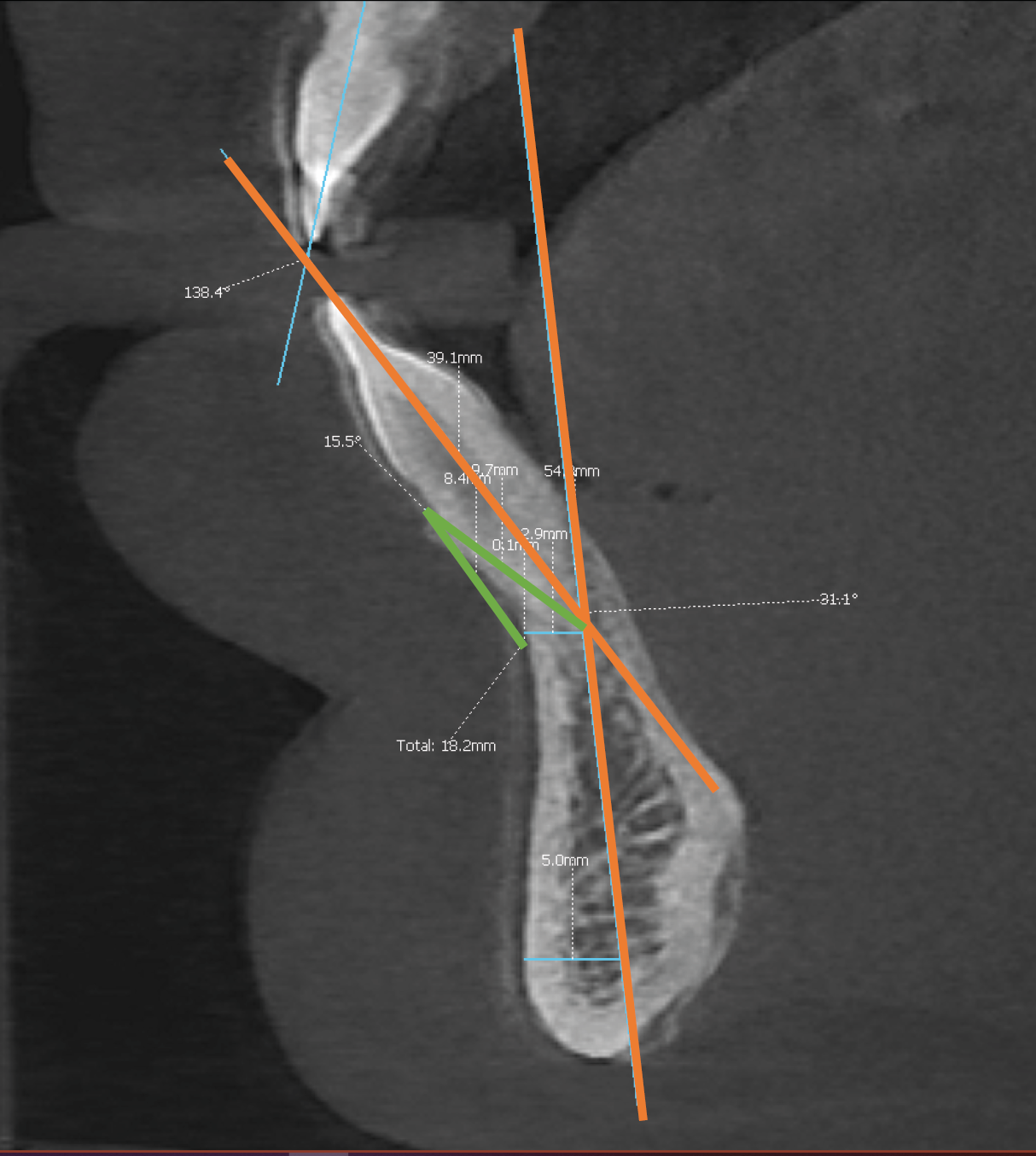 The GoGn angle is defined as the angle between the line connecting Gnathion (Gn) and Gonion (Go) and the long axis of the lower incisor. Its average value is approx. 90°. This angle provides information about the inclination of the alveolar process and teeth relative to the GoGn line.25 It was measured on the sagittal plane of the entire area, which mimics a cephalometric X-ray. For optimal precision, the angle was measured using a protractor on a fixed screen image (Figure 3).26