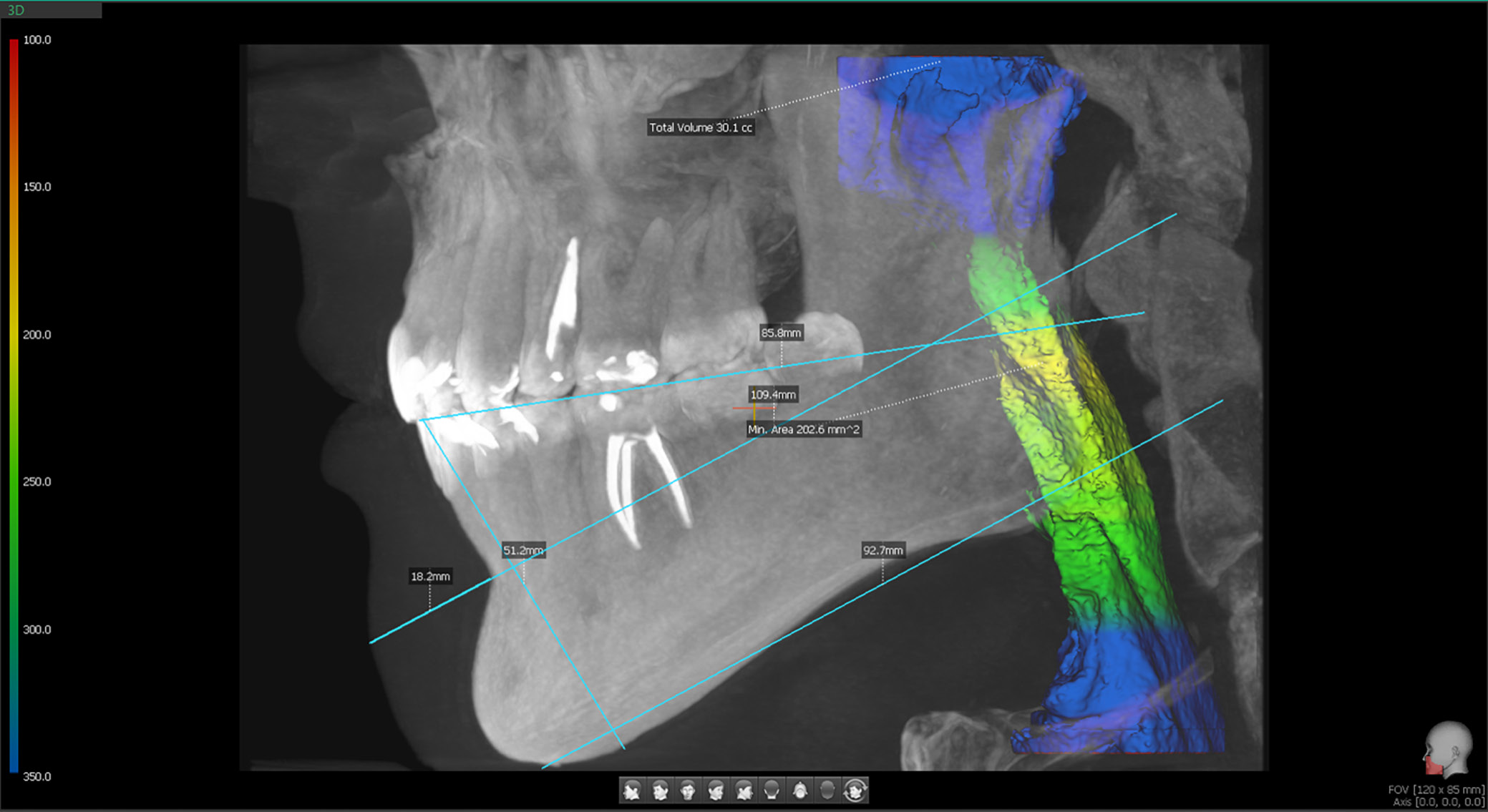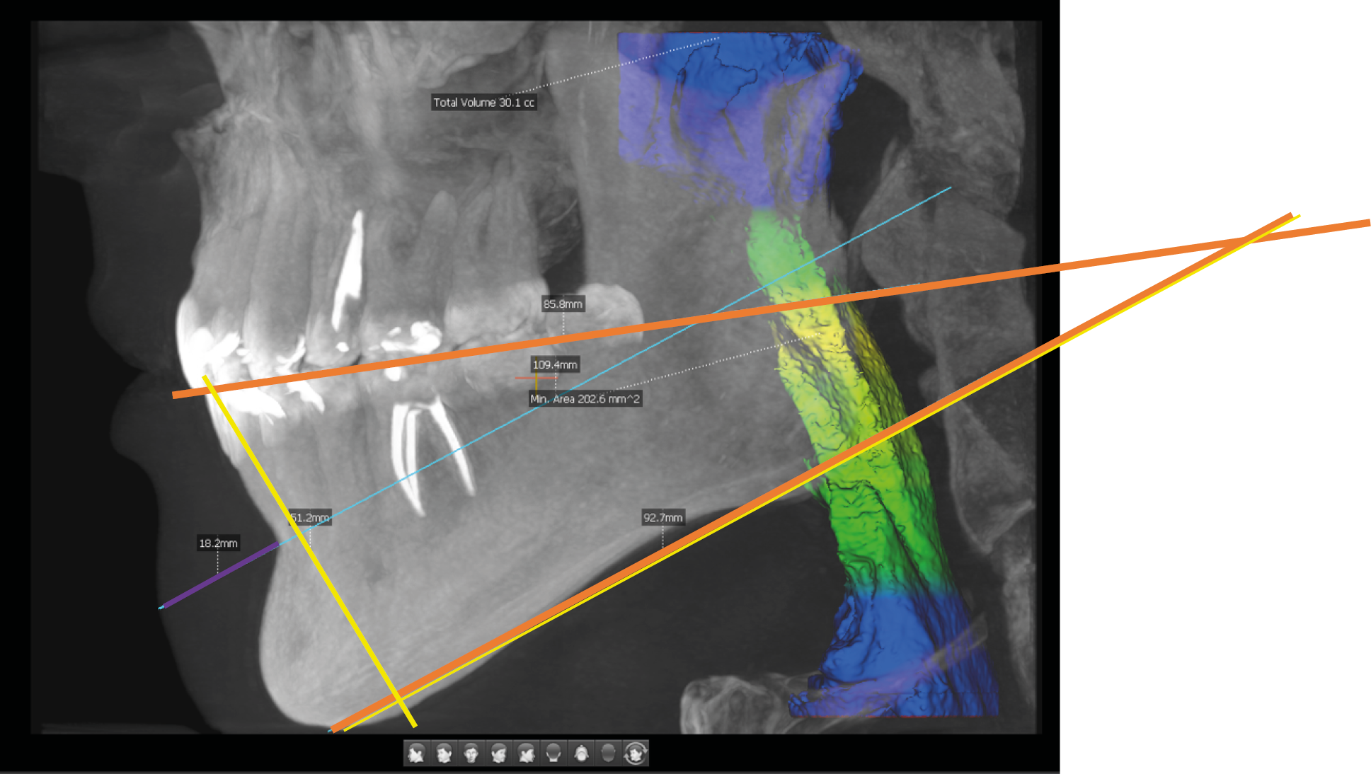 Airway measurement has become accessible to dentists through the increased use of CBCT. Thanks to built-in software, airway assessment is now one of the options available during routine X-ray examinations. It is reported – and as shown in Figure 5 below – that an airway capacity of approx. 200 mm² is considered satisfactory. To measure the airways, a CBCT scan with the full available field of view (80 mm in width and 50 mm in height) is required. Subsequently, the visible airway, extending from the nasopharynx to the sphincter, should be marked. It is known that airway narrowing is quite common in cases of malocclusion, especially in Class II malocclusion, where the retruded mandible reduces the space available for the tongue and decreases airway capacity.