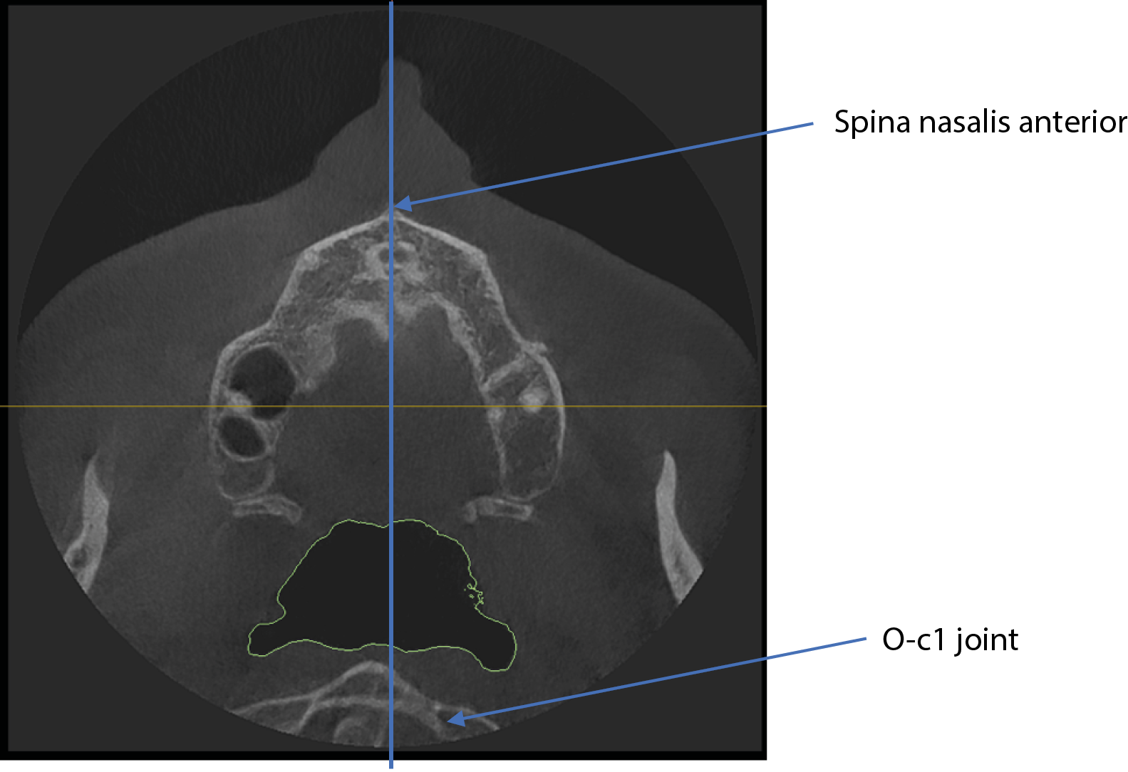 In addition to airway volume, the study investigated the correlation between lower airway capacity, dental abnormalities, and postural problems at a vertebral level. The deviation of the O-C1 (atlanto-occipital) joint was measured by automatically drawing a sagittal midline-using the spina nasalis and the sutura palatina media as reference points. Any displacement of the O-C1 spinous process relative to this midline was used to assess vertebral asymmetry. The methodology is illustrated in Figure 6.