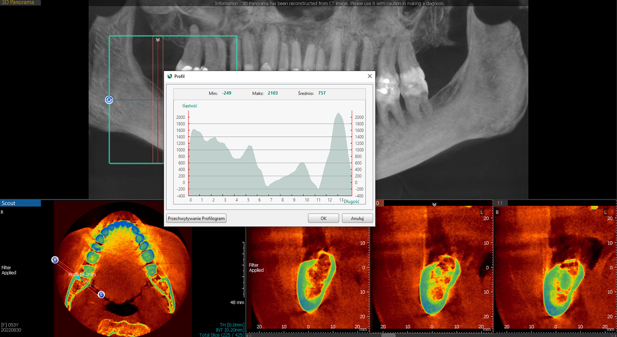 The CBCT scans were acquired using the Pax Flex3D Vatech computed tomography radiography system (Vatech® Europe, Prague, Czech Republic). For the mandible center image, a field of view (FOV) of 80 mm in width and 50 mm in height was used, with a voxel size of 0.2 mm³. All images were analyzed using EzDent-i software (Vatech). Only CBCT scans that displayed the entire mandible and maxilla were included in the analysis.