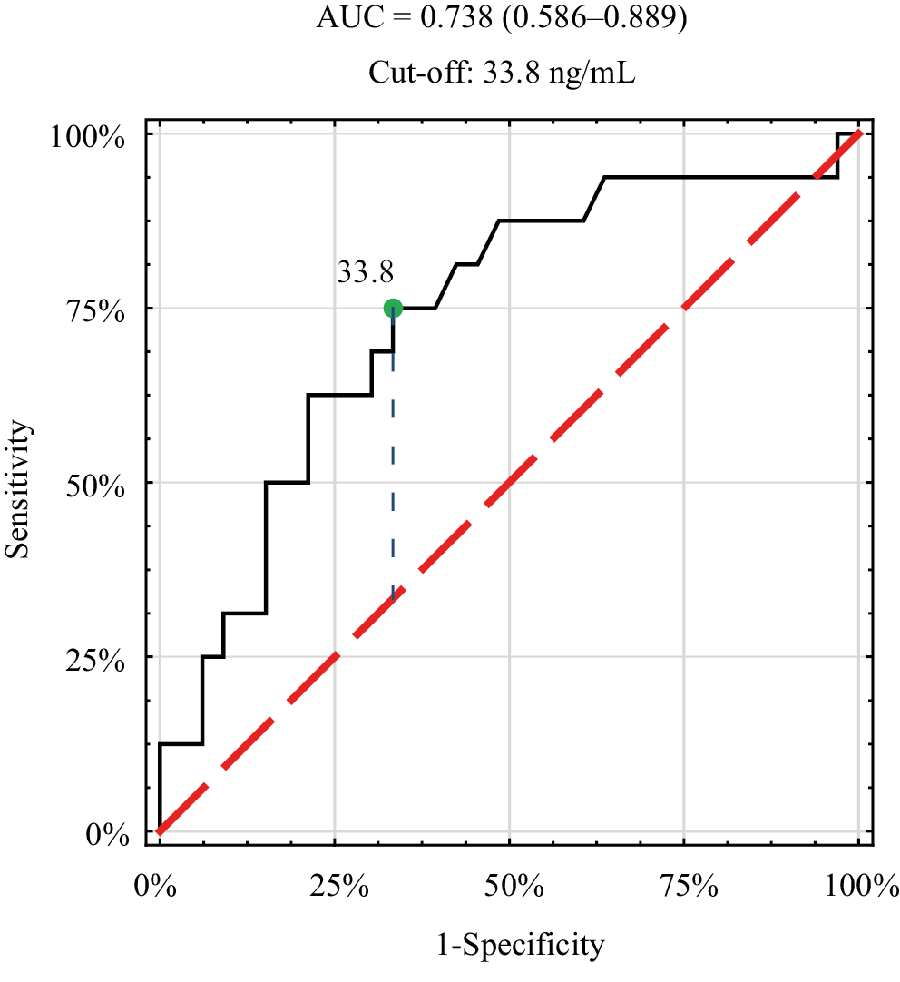 Group A and group B patients were combined, and for this dichotomous division (A + B vs C), the optimal vitamin D₃ concentration threshold was determined using ROC curve analysis (Figure 8).