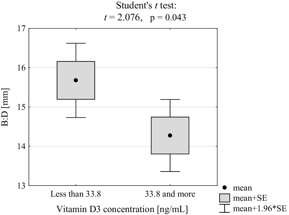 Lower density is also visible in the course of hemorrhagic cyst and all types of dysplasia. Another factor is the level of vitamin D. More and more studies show or confirm correlation between its deficiency and tissue functioning. Vitamin D3 influences bone remodeling and muscles activity, has an anti-inflammatory effect and influences autoimmune diseases. As vitamin D3 receptors are present in muscle tissue, its higher amount will allow muscles to work with less contraction and more resilience. It is shown in our results as a better tongue position and slimer mentalis muscle in people with vitamin D3 concentration in serum over 33.8 ng/mL, which is similar level to the mean value – 30–100 ng/mL.46, 47, 48 However, we found the tendency to lowering of the API-CEJ2-B with lowering of vitamin D serum concentration (without statistically important significance). This may lead to the conclusion that with lower concentration of vitamin D, the lesser thickness of labial bone wil be present, as it is visible in the group C <20 ng/mL API-CEJ2-B reach only 17.5°. These findings are comparable to those of Leszczyszyn et al.14, who suggested that low concentrations of vitamin D3 are associated with a significantly increased risk of recession. They also found that low vitamin D levels correlate with crowding in the upper jaw, crossbite and narrowing of the upper arch. Furthermore, in another publication, the constructed model of multiple regression for parameters which influence significantly gingival recession (API-CEJ2-B, CEJ2-ID, age) allowed to explain their potential recession-causing influence in 72% chance of the recession occurence.49