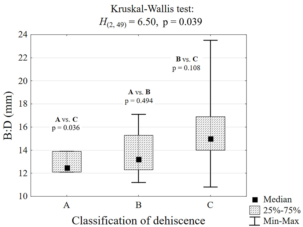 A statistically significant relationship (Figure 10) was observed between the width of the mentalis muscle and the dehiscence class. In patients with class C dehiscence, the mental width was significantly greater compared to class A patients (15.0 mm vs 12.5 mm, p = 0.036).