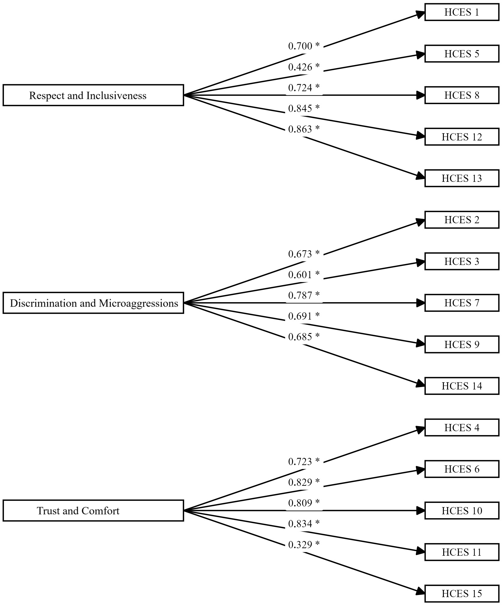 All item loadings were statistically significant (p < 0.001), ranging from 0.329 to 0.863, indicating adequate association with their respective subscales. Cronbach’s α coefficients showed acceptable internal consistency across the 3 subscales: Respect and Inclusiveness (α = 0.770), Discrimination and Microaggressions (α = 0.745) and Trust and Comfort (α = 0.778). McDonald’s ω index (ω = 0.92) further confirmed the strong internal consistency of the scale.
