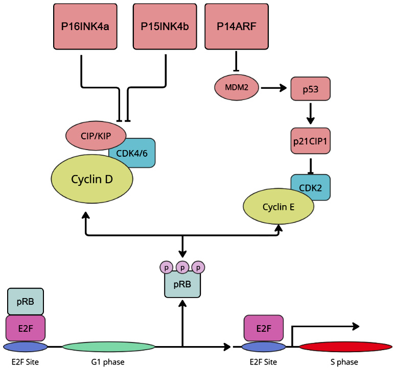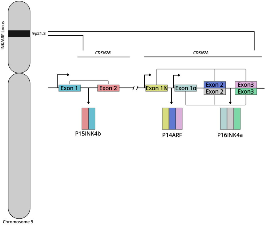 P16INK4a and P15INK4b bind and inhibit CDK4 and CDK6, which in turn are significant to relieve the cell cycle inhibitory activity of the retinoblastoma (Rb) tumor suppressor, whereas P14ARF is an activator of tumor suppressor p53 (Figure 2).7, 9, 10