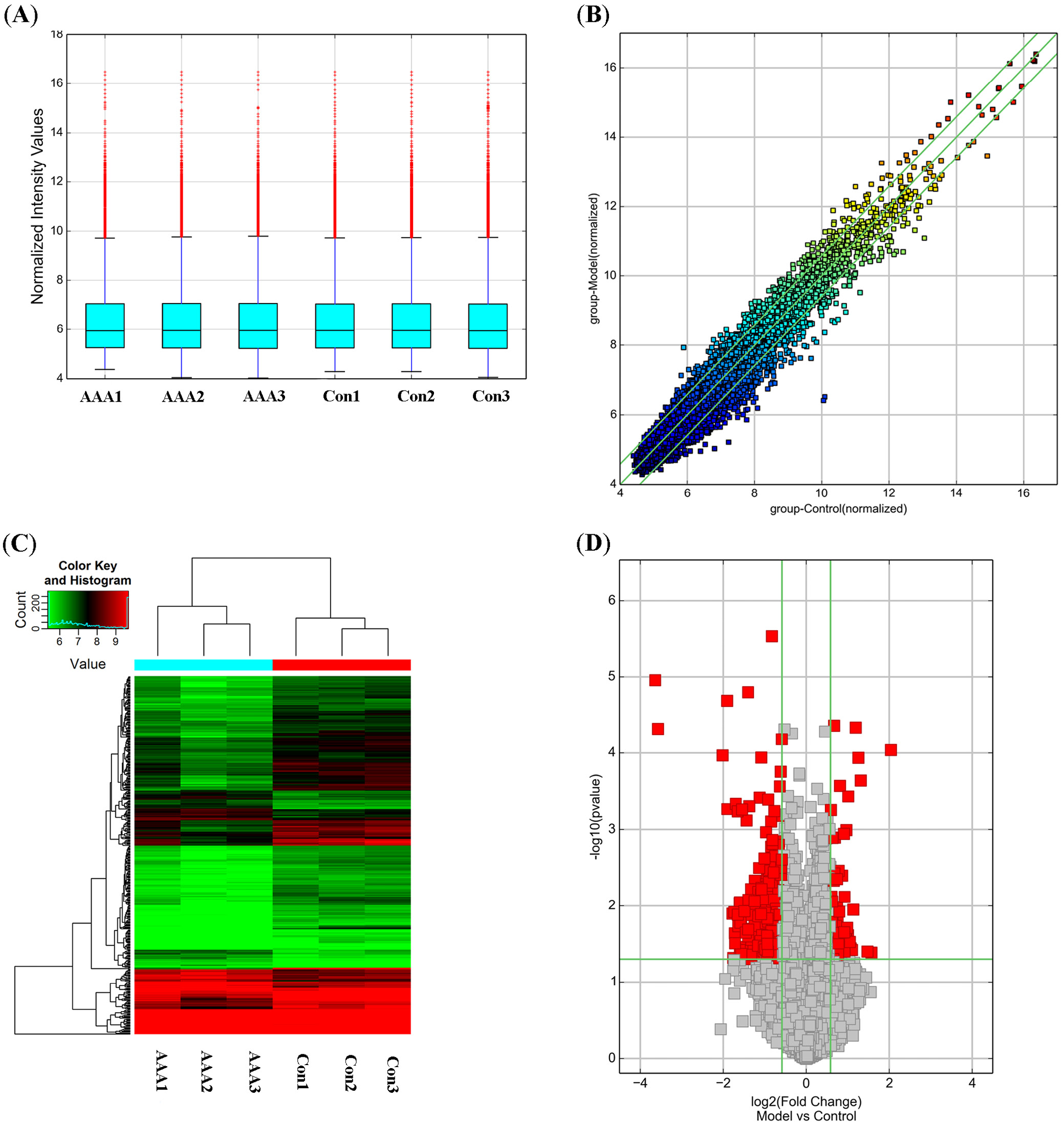 Differentially expressed circRNAs between the Ang II-induced AAA group and the control group were identified using Student’s t-test and fold-change filtering (fold change ≥1.5; p < 0.05), resulting in 90 upregulated and 234 downregulated circRNAs. The volcano plot and hierarchical clustering revealed the circRNA expression profiles between the AAA group and the control group (Figure 1).