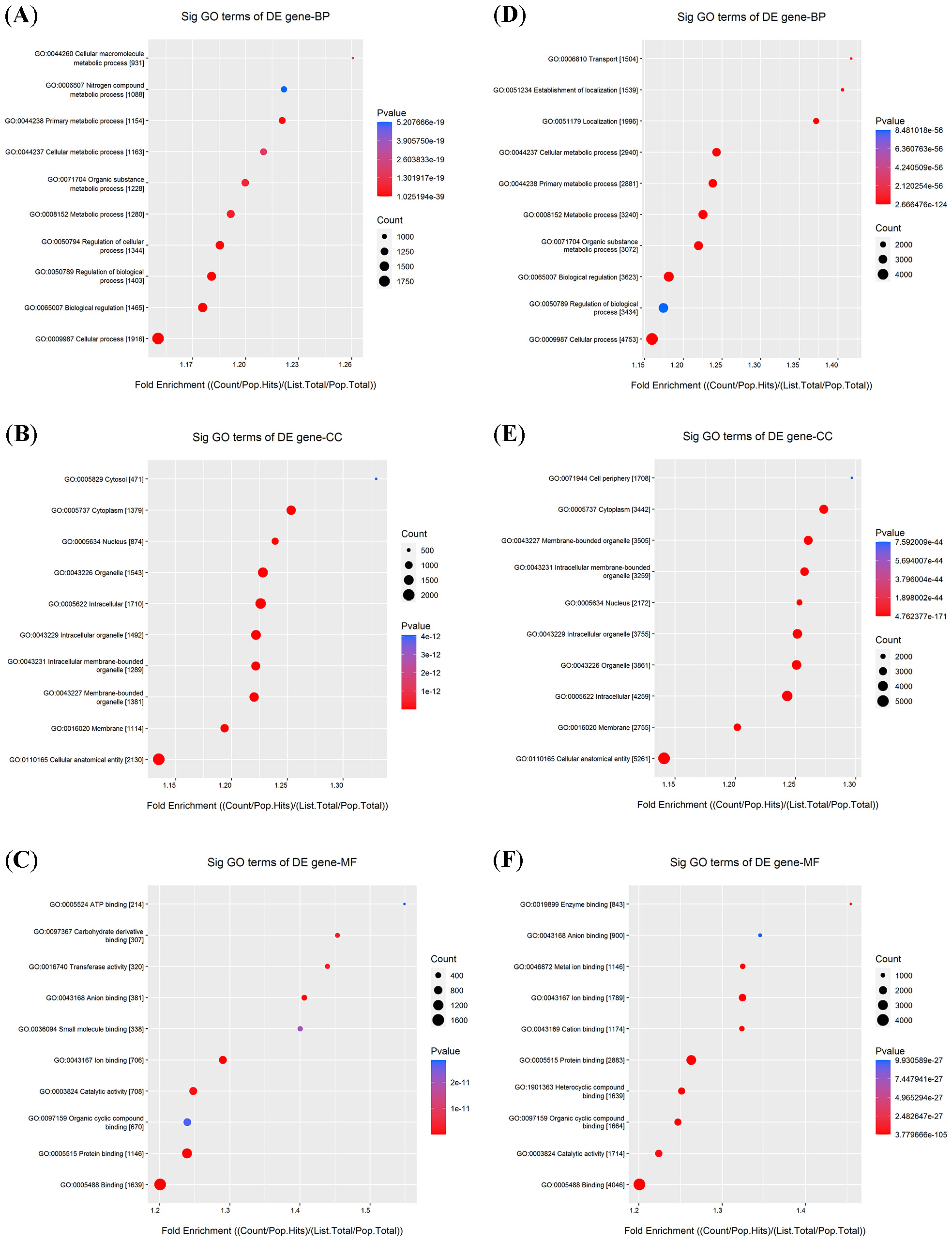 Previous studies have demonstrated that circRNAs can act as miRNA sponges to modulate gene expression. Based on this regulatory mechanism, we performed a bioinformatics analysis using miRanda (https://www.microrna.org)and TargetScan (https://www.targetscan.org) to predict potential miRNA targets of the differentially expressed circRNAs. Subsequently, the predicted target genes were subjected to GO and KEGG pathway enrichment analyses. Gene Ontology enrichment analysis of the upregulated target genes revealed significant enrichment in several processes, including cellular macromolecule metabolism and nitrogen compound metabolism (Figure 2A). Regarding cellular components, these genes were primarily associated with intracellular membrane-bounded organelles and the nucleus (Figure 2B). The most enriched molecular functions were carbohydrate derivative binding and ATP binding (Figure 2C).