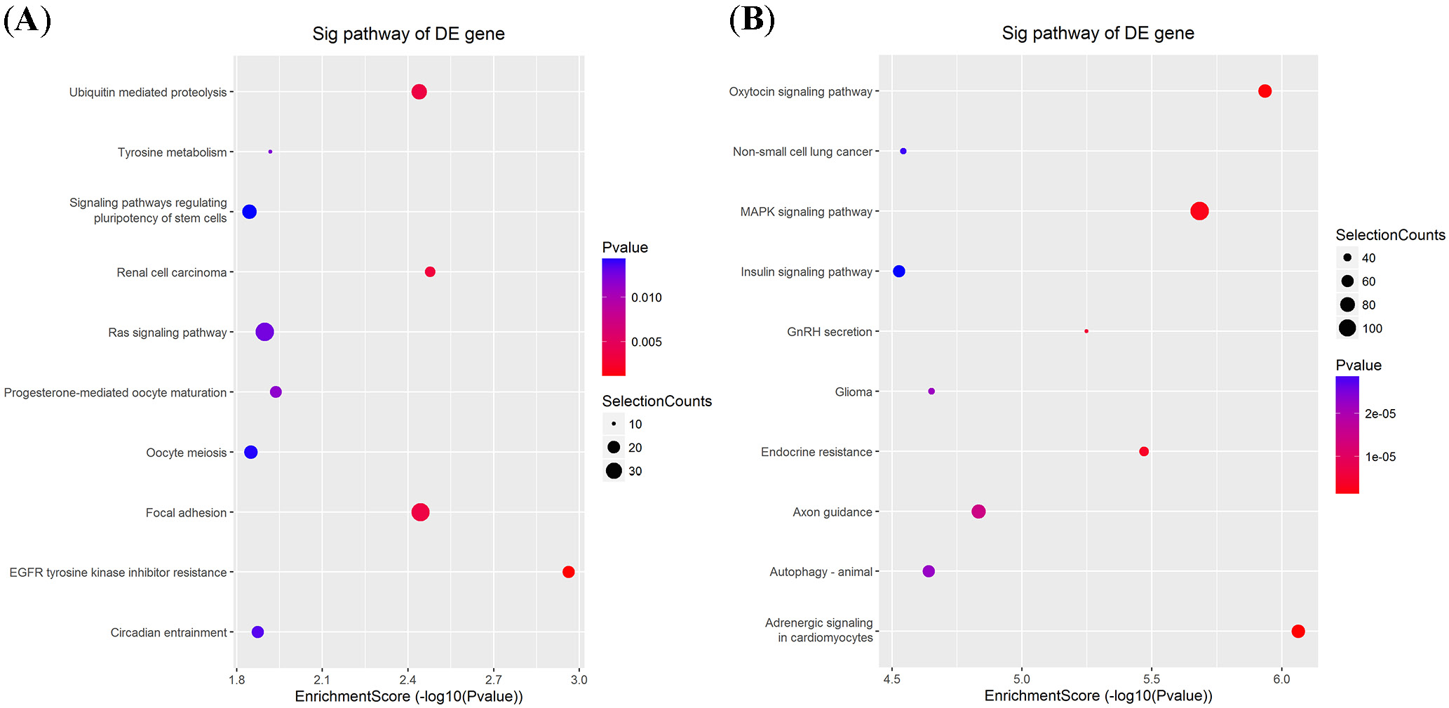In contrast, the downregulated target genes were primarily enriched in primary metabolic processes and the establishment of localization (Figure 2D). In the cellular component category, they were enriched in membrane-bounded organelles and membranes (Figure 2E), while molecular functions were enriched in cation binding and heterocyclic compound binding (Figure 2F). The KEGG pathway analysis further revealed that 39 pathways were associated with the upregulated mRNAs and 127 pathways with the downregulated mRNAs. Notably, several crucial pathways, such as the insulin signaling pathway, Ras signaling pathway, MAPK signaling pathway, and autophagy, were potentially influenced by the altered circRNAs (Figure 3).