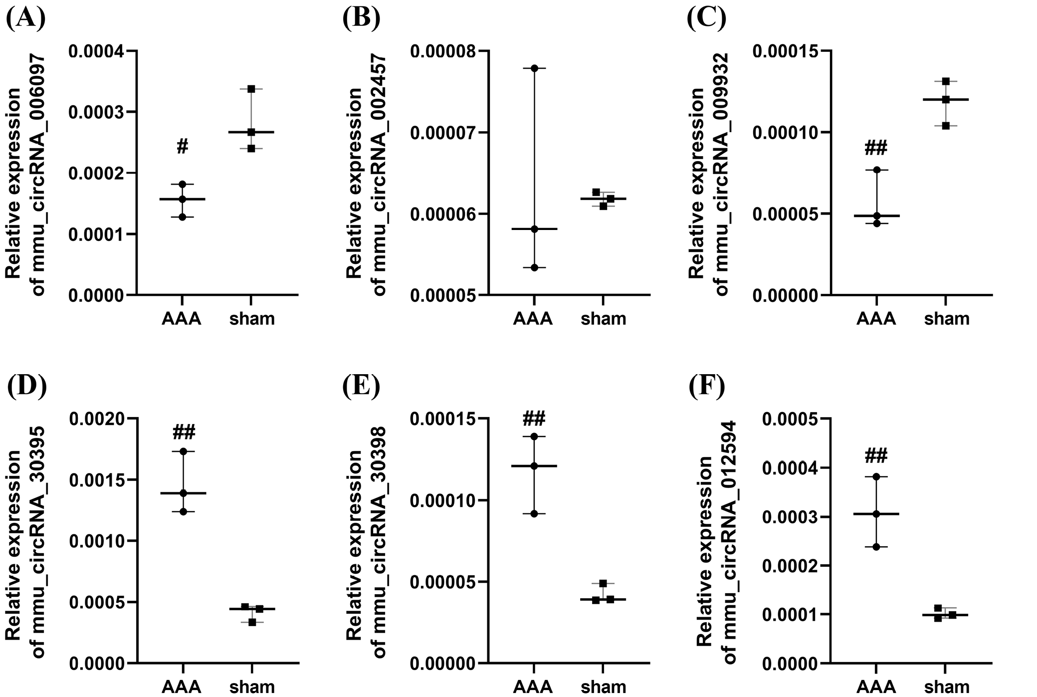 This study aimed to identify differentially expressed circular RNAs (circRNAs) in Ang II-induced AAA mouse models using a circRNA microarray platform. The expression levels of selected circRNAs were further validated by reverse transcription quantitative polymerase chain reaction (RT-qPCR). Additionally, a custom bioinformatics tool, integrating the miRanda and TargetScan algorithms, was used to predict potential circRNA/miRNA interaction networks.