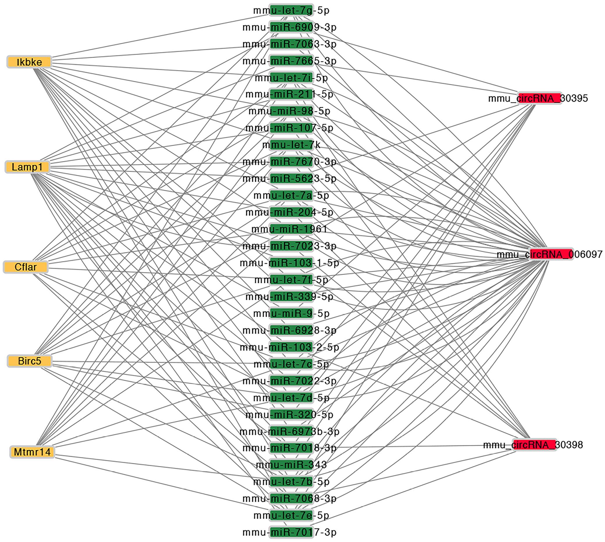 To identify the most informative candidates, the 5 validated circRNAs were used to construct a comprehensive ceRNA regulatory network. As mentioned earlier, autophagy plays a significant role in AAA pathogenesis, so we focused on autophagy-related target genes. Further bioinformatics analysis revealed that the target genes of mmu_circRNA_30398, mmu_circRNA_006097 and mmu_circRNA_30395 were predominantly enriched in the autophagy pathway. The downstream target genes of circRNAs involved in autophagy in this ceRNA network include Birc5, Cflar, Ikbke, Mtmr14, and Lamp1.