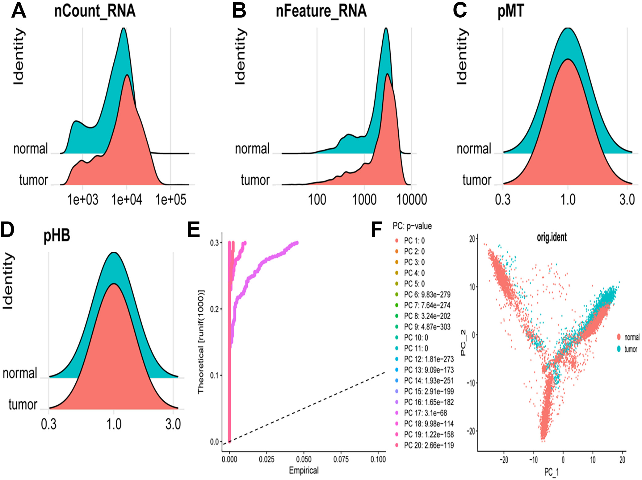 Figure 1 presents a comprehensive analysis of scRNA-seq data comparing normal and tumor cells. Panels A–D display density plots of various metrics, whereas panels E, F present results from PCA. The density plot illustrates the distribution of total RNA counts per cell for normal (blue) and tumor (red) cells, revealing a broader and higher distribution of RNA counts in tumor cells, indicative of increased transcriptional activity (Figure 1A). This plot demonstrates the distribution of the number of detected genes per cell, with tumor cells exhibiting a higher number of detected genes, suggesting increased gene expression diversity (Figure 1B). The density plot depicting mitochondrial gene expression percentage shows a similar distribution for both normal and tumor cells, although tumor cells exhibit a slight shift towards higher mitochondrial gene expression, potentially indicating altered metabolic states (Figure 1C). The plot representing hemoglobin gene expression percentage shows overlapping distributions for normal and tumor cells, with tumor cells displaying slightly higher hemoglobin gene expression (Figure 1D). The scree plot illustrates the variance explained by each principal component, with the first few principal components accounting for the majority of variance in the data. Although p-values are provided for each principal component, they indicate statistical significance rather than effect magnitude. The relative importance of principal compotents is better assessed by the proportion of variance they explain, as visualized in the scree plot (Figure 1E). The scatter plot visualizes the PCA results, with cells plotted according to their scores on the first 2 principal components. Normal (blue) and tumor (red) cells formed distinct clusters, indicating substantial differences in their gene expression profiles. The separation along principal compotent 1 and principal component 2 suggests that these principal components capture the major sources of variation between normal and tumor cells (Figure 1F).