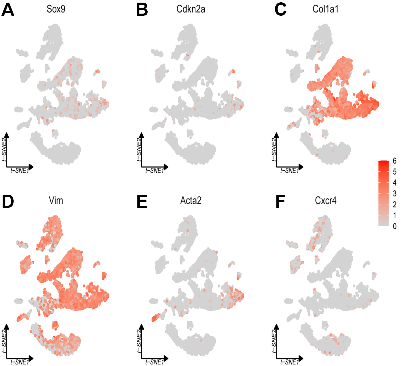 Figure 3C displays the expression of Col1a1, which is concentrated in specific regions of the dataset, indicating that Col1a1 is expressed at lower levels throughout much of the brain, suggesting that Col1a promoter-driven Cre recombinase primarily exists in specific cell populations, such as those producing extracellular matrix (ECM; Figure 3C). The t-SNE plot for Vim demonstrates broad expression across various clusters, with several regions exhibiting higher expression levels. The lower cluster is enriched with cell types similar to mesenchymal cells, characterized by the expression of their derived marker, Vim (Figure 3D). The Acta2 expression plot indicates that Acta2 is concentrated in specific clusters, suggesting predominant expression in certain cell populations, potentially smooth muscle cells or myofibroblasts, due to its role in actin filament formation (Figure 3E). The expression of Cxcr4 is depicted in the t-SNE plot, showing scattered and relatively low expression across the clusters, indicating that this gene is expressed at lower levels or in fewer cell populations compared to the other genes illustrated (Figure 3F).