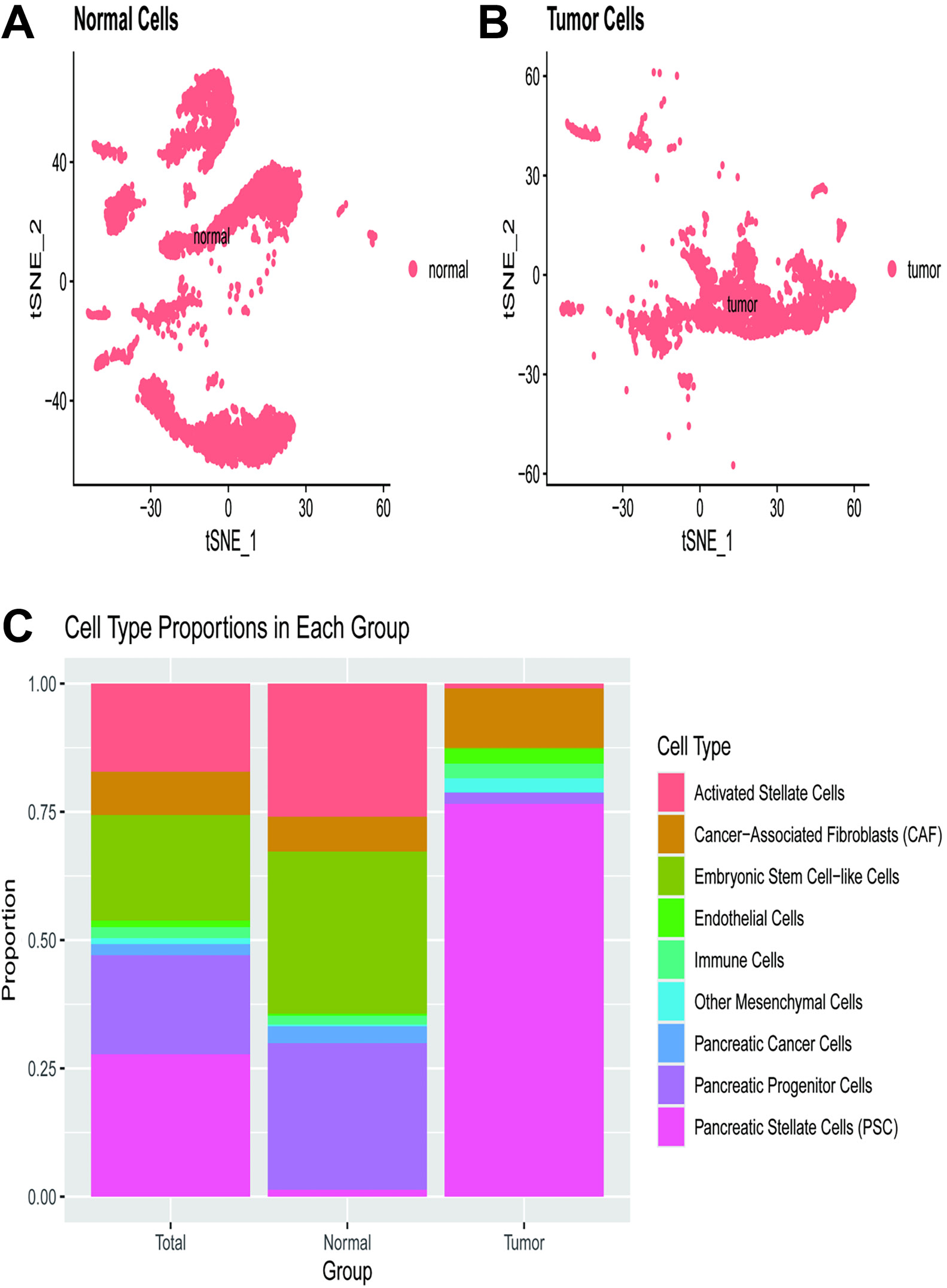The t-SNE plot (Figure 4) visualizes the distribution of normal cells within a 2-dimensional space, with each dot representing a single cell. The clustering pattern illustrates the presence of distinct cell populations within the normal tissue, with spatial separation suggesting heterogeneity among normal cells (Figure 4A). Another t-SNE plot displays the distribution of tumor cells, where each dot again represents a single cell. The clustering pattern indicates the presence of various cell populations within the tumor tissue. In comparison to normal cells, tumor cells appear more densely packed and less dispersed, indicating alterations in cellular composition and gene expression profiles (Figure 4B). A bar plot compares the proportions of different cell types across the total, normal, and tumor groups. The cell types are color-coded as follows: activated stellate cells (orange), cancer-associated fibroblasts (CAF) (green), embryonic stem cell-like cells (cyan), endothelial cells (blue), immune cells (purple), other mesenchymal cells (brown), PC cells (dark pink), pancreatic progenitor cells (light blue), and PSC (pink). In the normal group, PSC and other cell types are well-represented. Conversely, in the tumor group, PC cells dominate, accompanied by a noticeable increase in CAF and a decrease in other cell types such as PSC.