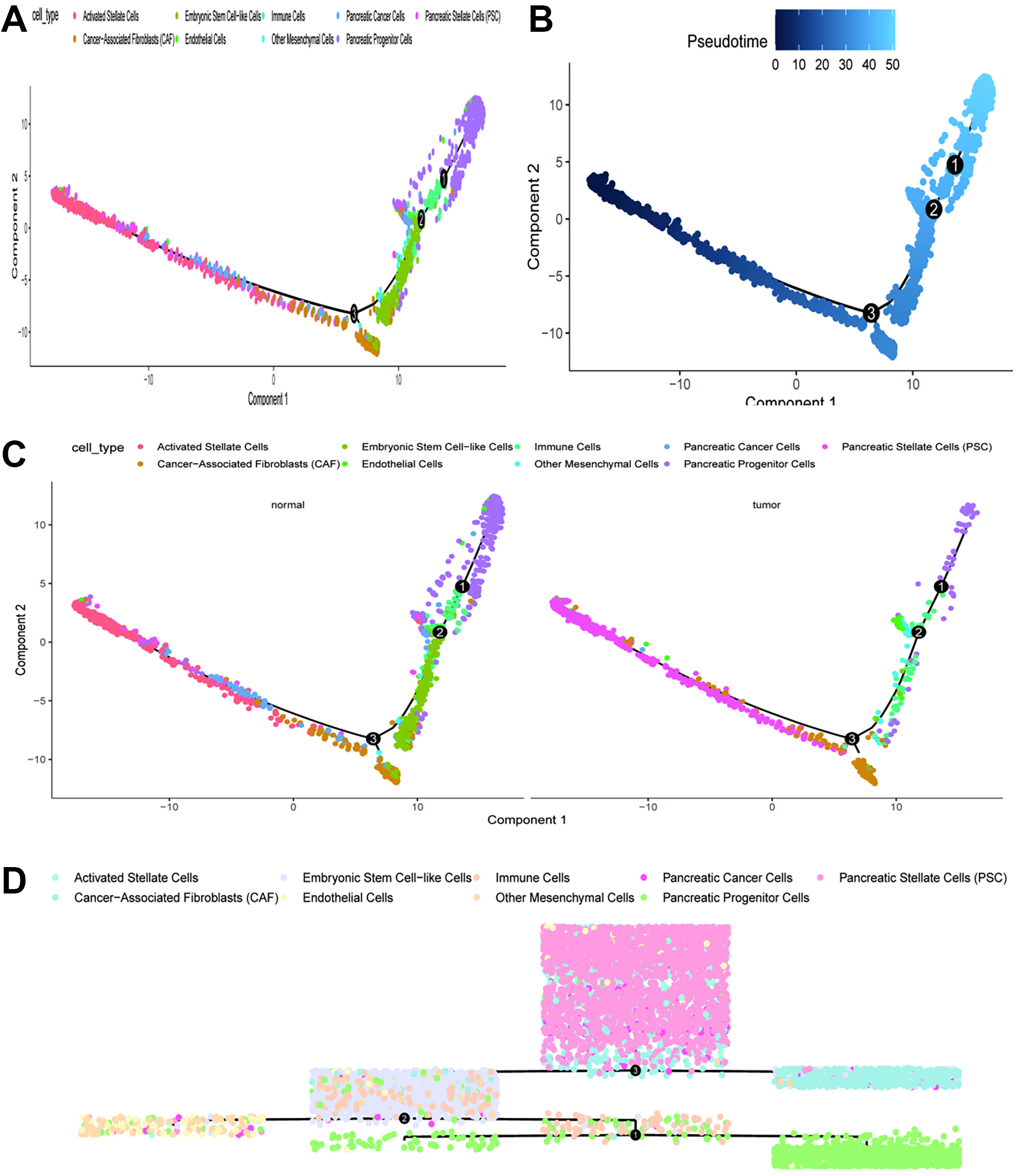 Figure 5 presents visualizations of cell type distributions along pseudotime and comparisons between normal and tumor cells. This plot displays the pseudotime trajectory of cells, color-coded by cell types. The trajectory is represented in a 2-dimensional space, with components 1 and 2 indicating the PC. The cell types are color-coded: activated stellate cells (orange), CAF (green), embryonic stem cell-like cells (cyan), endothelial cells (blue), immune cells (purple), other mesenchymal cells (brown), PC cells (dark pink), pancreatic progenitor cells (light blue), and PSC (pink). The trajectory suggests a progression from one cell type to another, implying a potential differentiation pathway or cellular transition process (Figure 5A).