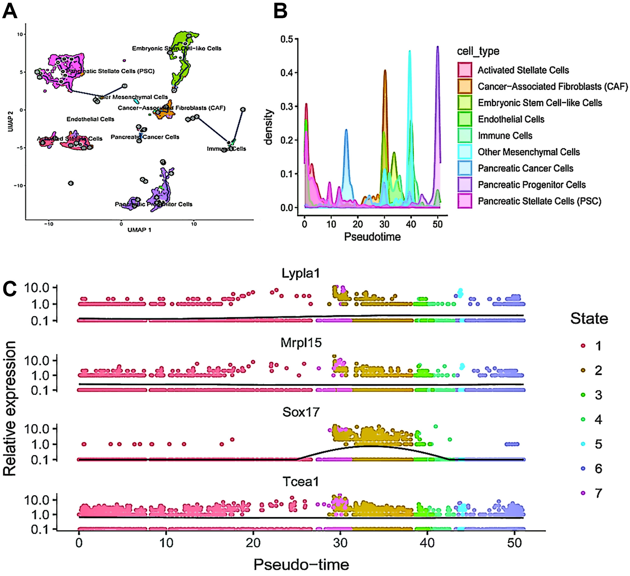 The UMAP plot (Figure 6A) illustrates the distribution of cells in 2-dimensional space, color-coded by cell type. The pseudotime trajectory is overlaid, demonstrating the progression of cells through various states. The cell types are color-coded as follows: activated stellate cells (orange), CAF (green), embryonic stem cell-like cells (cyan), endothelial cells (blue), immune cells (purple), other mesenchymal cells (brown), PC cells (dark pink), pancreatic progenitor cells (light blue), and PSC (pink). The trajectory lines connect different clusters, suggesting pathways of cellular differentiation or transition. This plot also depicts the density of various cell types along the pseudotime axis, with each cell type represented by a different color, consistent with those in Figure 6A. The density peaks indicate where specific cell types are most prevalent along the pseudotime trajectory. For instance, PC cells (dark pink) and cancer-associated fibroblasts (CAFs; green) exhibit distinct expression peaks, suggesting critical transition points in their progression. These plots illustrate the expression levels of 4 genes (Lypla1, Mrpl15, Sox17, and Tcea1) over pseudotime, with each dot representing a single cell colored by its state (1–7) (Figure 6B). The black line represents the smoothed trend of gene expression over pseudotime. Key observations include: Lypla1 shows high expression early in pseudotime, decreasing as pseudotime progresses; Mrpl15 exhibits peak expression around the midpoint of the pseudotime trajectory; Sox17 displays a distinct peak in expression later in pseudotime, indicating its role in a specific state; Tcea1 has high expression early in pseudotime, followed by a gradual decrease (Figure 6C).