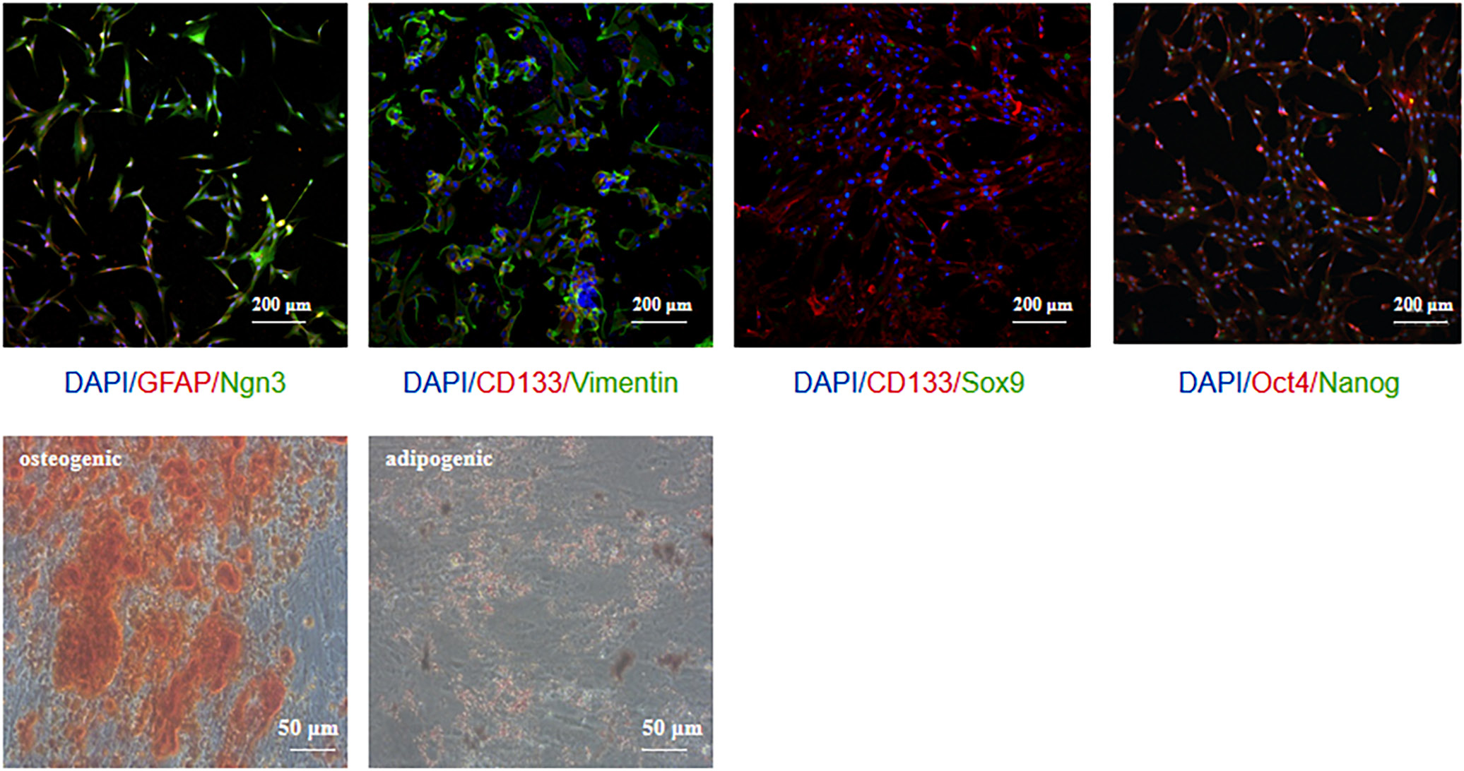 Figure 8 presents a comprehensive list of marker expression in PSC and their differentiation capacity. The top immunofluorescence images depict specific markers indicating co-expression in PSC (Vimentin and GFAP), corresponding to embryonic stem cell markers (Oct4, Nanog and CD133) and pancreatic progenitor cell markers (Ngn3 and Sox9) (Figure 8). The extent to which PSC differentiate into osteogenic, adipogenic, hepatic, and chondrogenic lineages is illustrated through phase-contrast microscopy images, which show the morphological changes associated with each differentiated state (Figure 8). Collectively, these analyses provide valuable insights into the cellular heterogeneity within PSC and their differentiation potential.