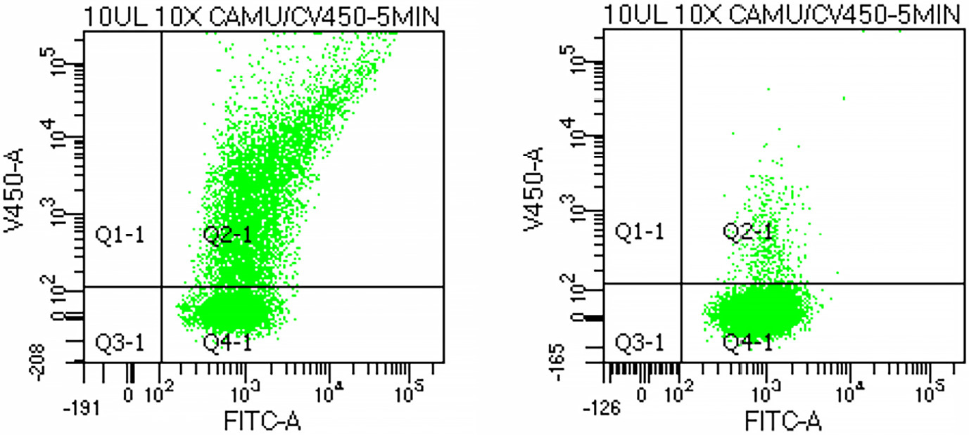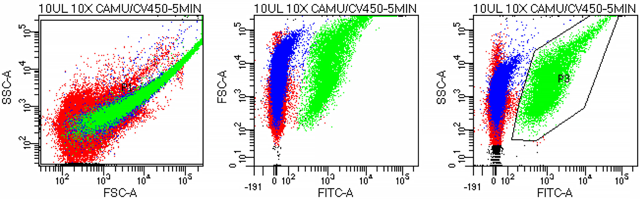 The platelet population was initially identified on a forward scatter (FSC) vs side scatter (SSC) plot and subsequently confirmed on an FSC vs FITC plot corresponding to CAMU-labeled platelets (Figure 1). The platelet gate (P3) was defined on the SSC vs FITC plot, and 10,000 events were acquired within this gate. Platelet aggregation was quantified as the proportion of double-positive (CAMU+/CV450+) events relative to all CAMU-positive platelets. Representative results showed 60.8% aggregation following ADP stimulation and 4.6% in the unstimulated control (Figure 2).