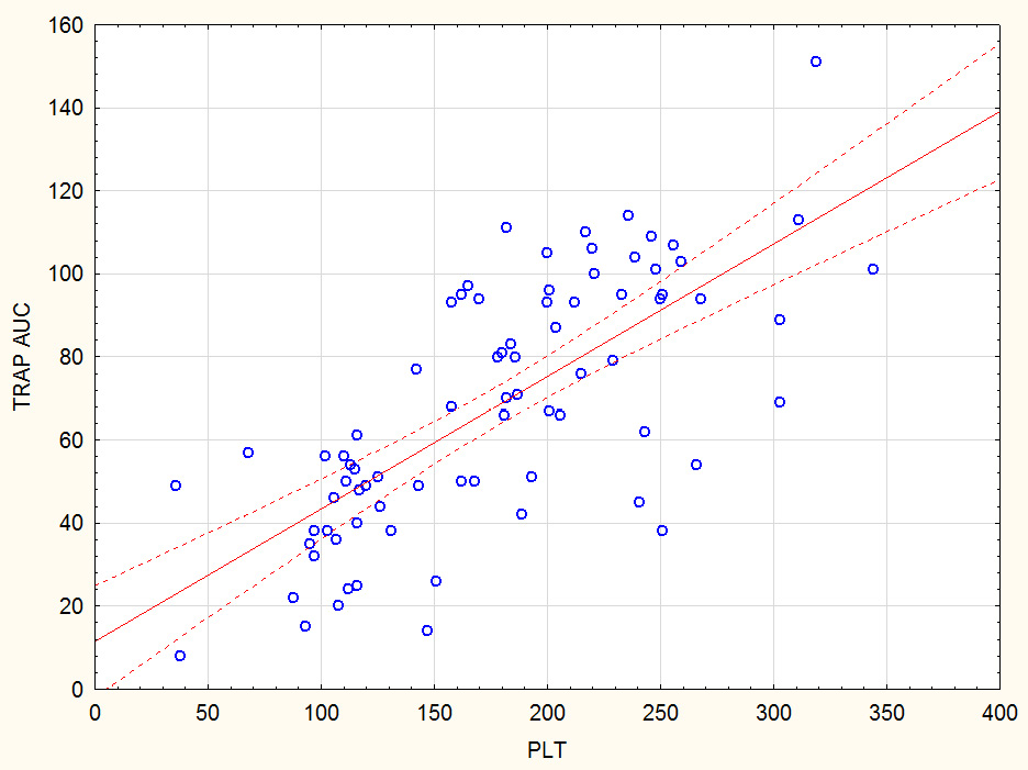 In the FC assay, ADP- and TRAP-induced responses were comparable between groups, whereas the AA-induced response was significantly higher in patients with thrombocytopenia. In patients with normal platelet counts, an optimal response to clopidogrel assessed using Multiplate aggregometry was defined as <48 AU. Receiver operating characteristic analysis showed that in patients with thrombocytopenia, the optimal FC cut-off indicating adequate P2Y12 inhibition was <25.7% (AUC = 0.75; sensitivity 60%; specificity 80%) (Figure 3). Using this threshold, 7 patients (23%) with thrombocytopenia had an inadequate response to clopidogrel despite low platelet counts. Correlation analysis showed a moderate association between platelet count and TRAP-induced aggregation in the pooled cohort (r = 0.62 for TRAP AUC; p < 0.05) and a weak association between platelet count and ADP-induced aggregation (r = 0.33 for ADP AUC; p < 0.05) (Figure 4).