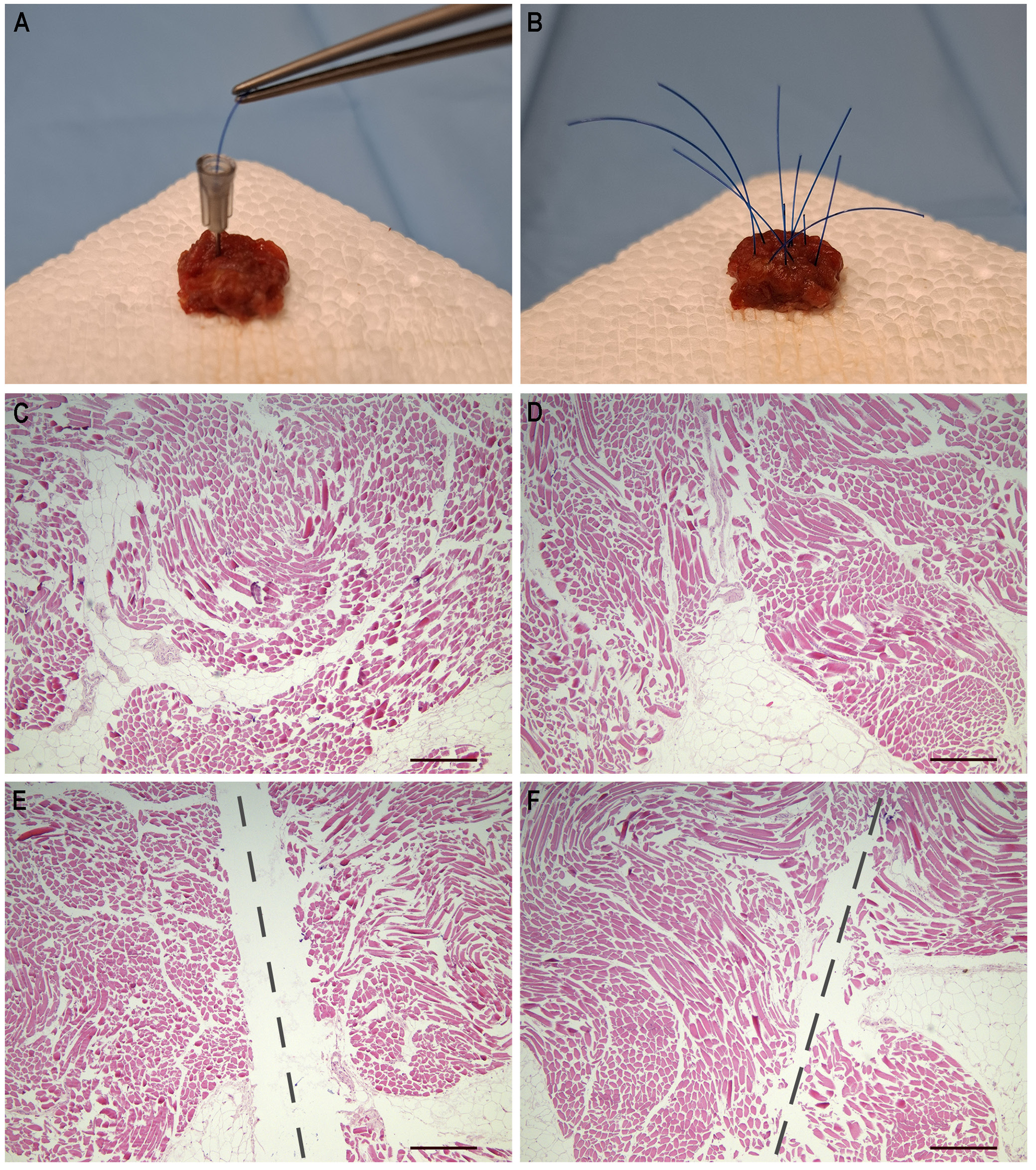 Materials and methods. Skeletal muscle tissue samples were harvested from a fresh-frozen 78-year-old male body housed at our Reference Center, Center for Body Donation. Needle transfixions were then tested using a novel technique designed for this purpose (PassTrue® methodology): full-thickness tissue transfixion by a needle, insertion into the needle of a coaxial thread, grasping the thread with forceps, and needle withdrawal, so that the in-place thread indicates the route of transfixion. This procedure was tested against the control procedure without a thread.