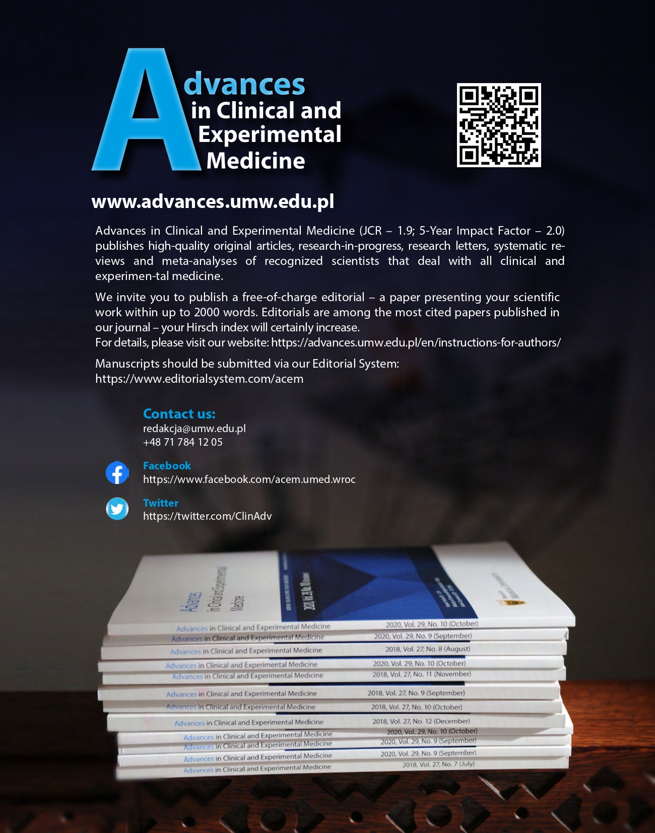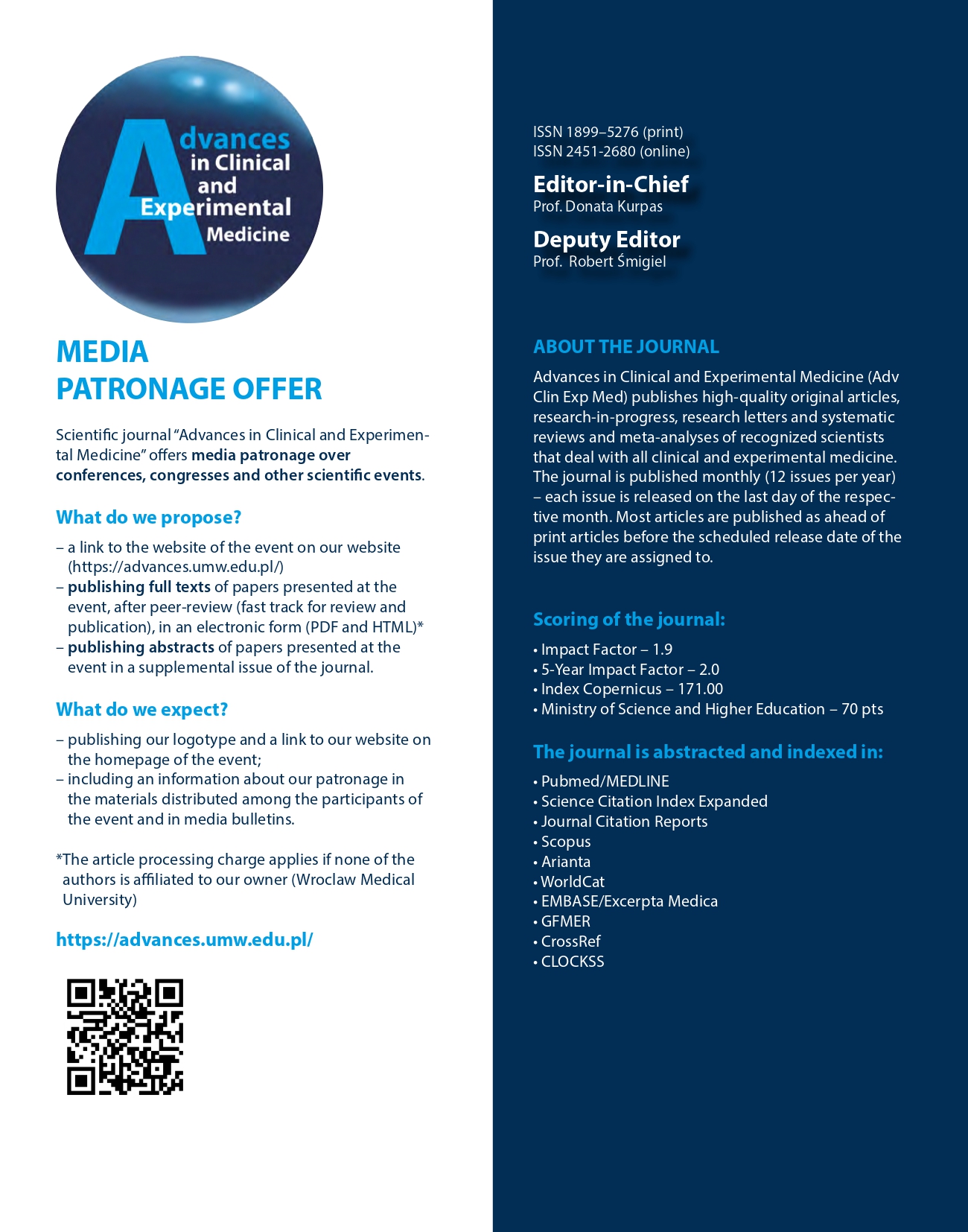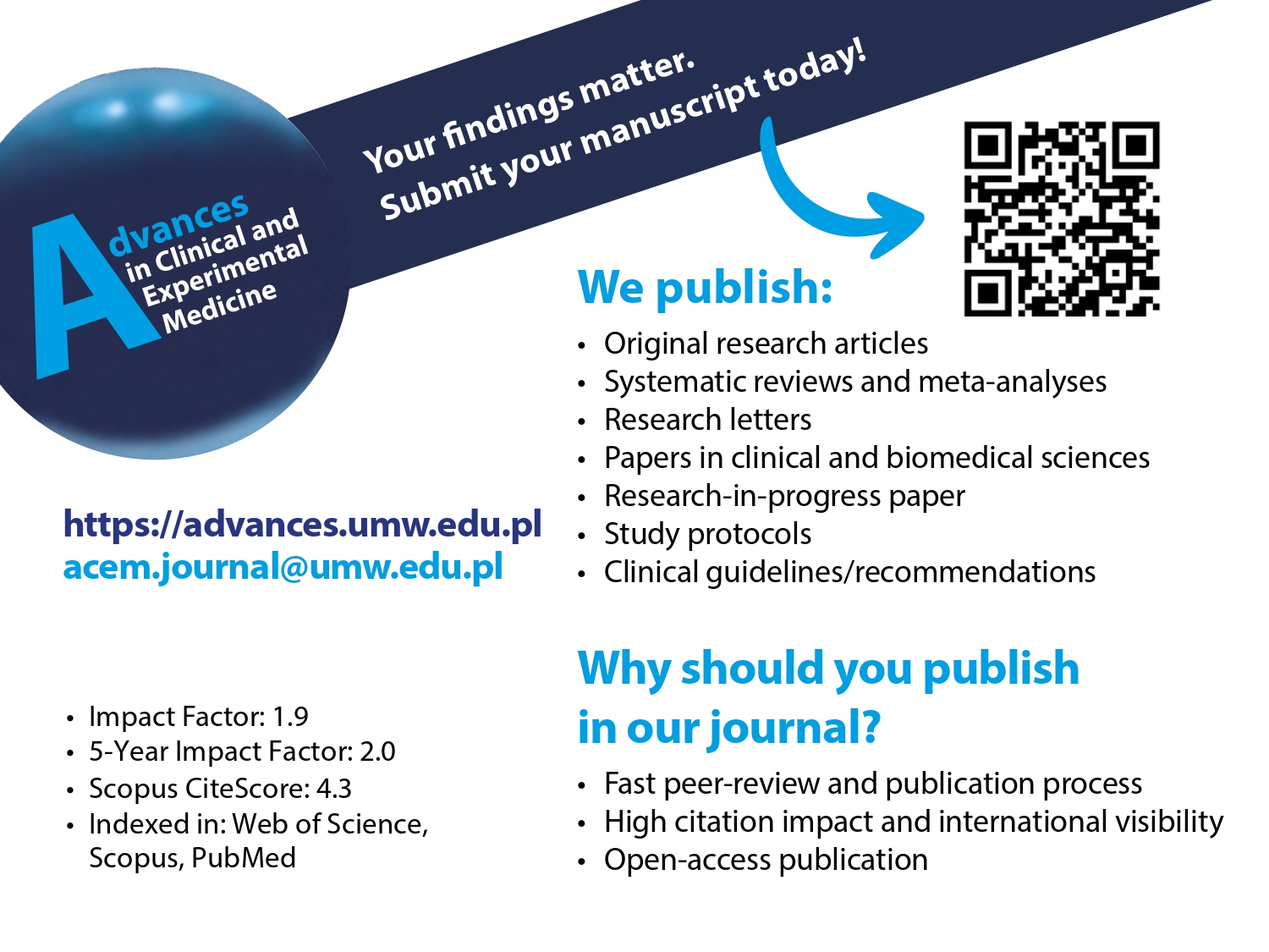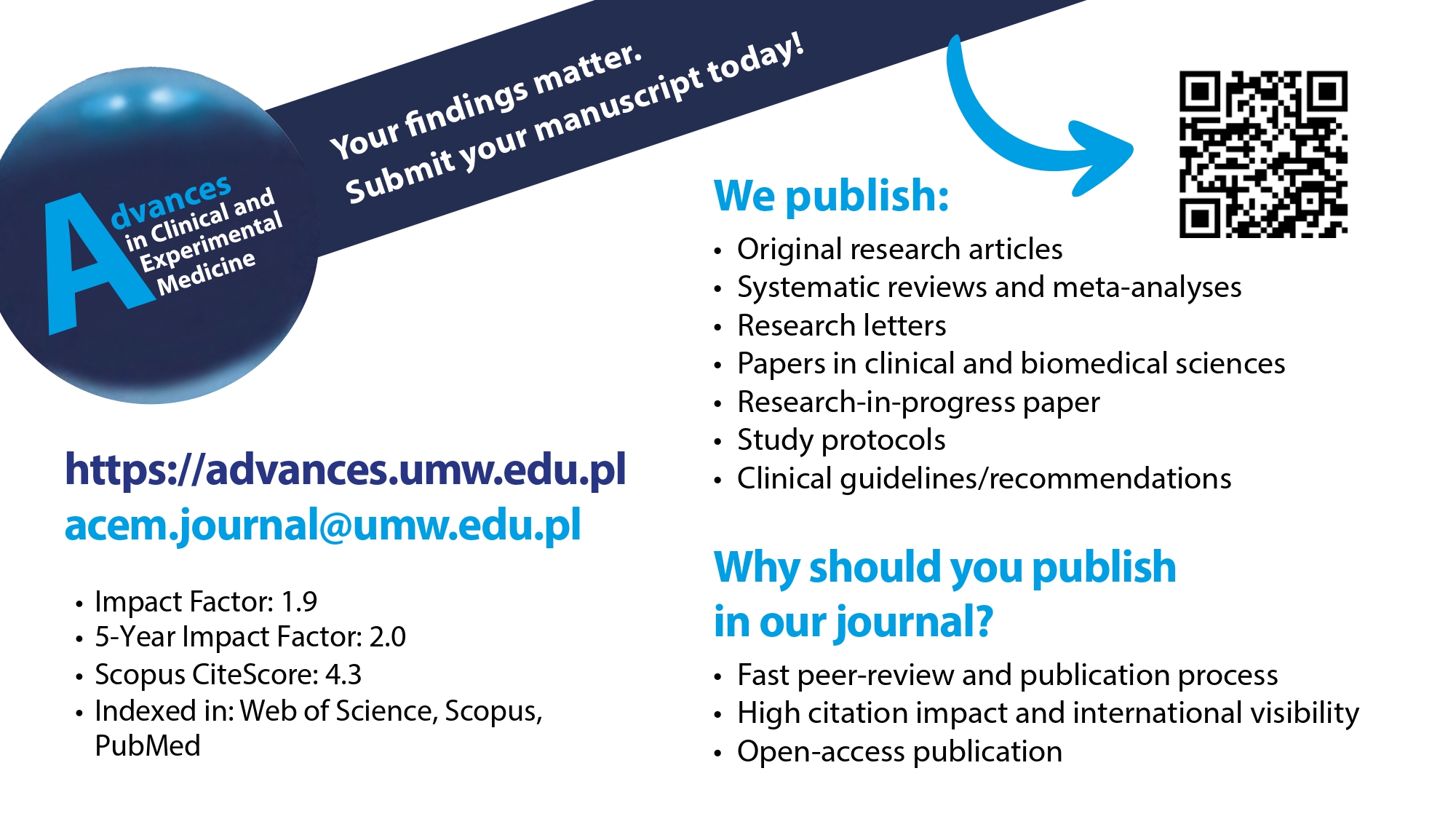 Our editorial team wants to help you promote Advances in Clinical and Experimental Medicine through numerous channels. We have provided a selection of support materials in PDF and JPEG formats to print instantly or share online on your social media, websites or library communication: